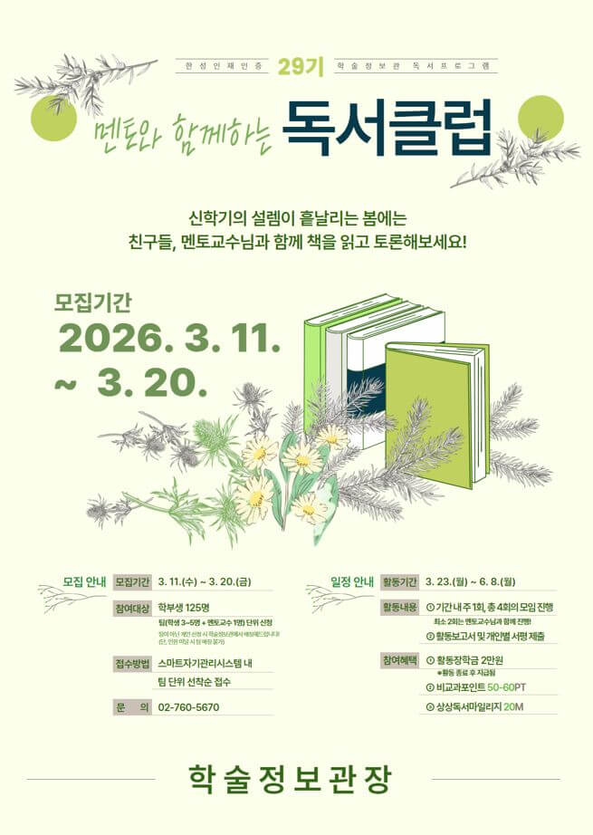 학우들과 함께 책을 읽고 비교과포인트와 장학금도 받는 뿌듯한 1학기 보내세요!